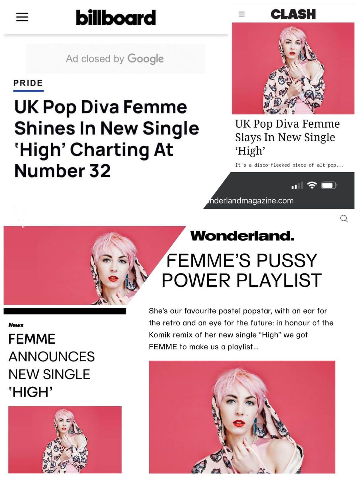 The initial brief for FEMME’s marketing campaign was to find premiere partners for each track on her ‘Covers’ EP. Sharpline Distro were taken on, on a full time basis, with the plan to broaden FEMME out of the smaller and niche areas she was popular online already, reaching new and bigger audiences, while always keeping things very…FEMME…stylish, sexy, kitsch, fun, pop.