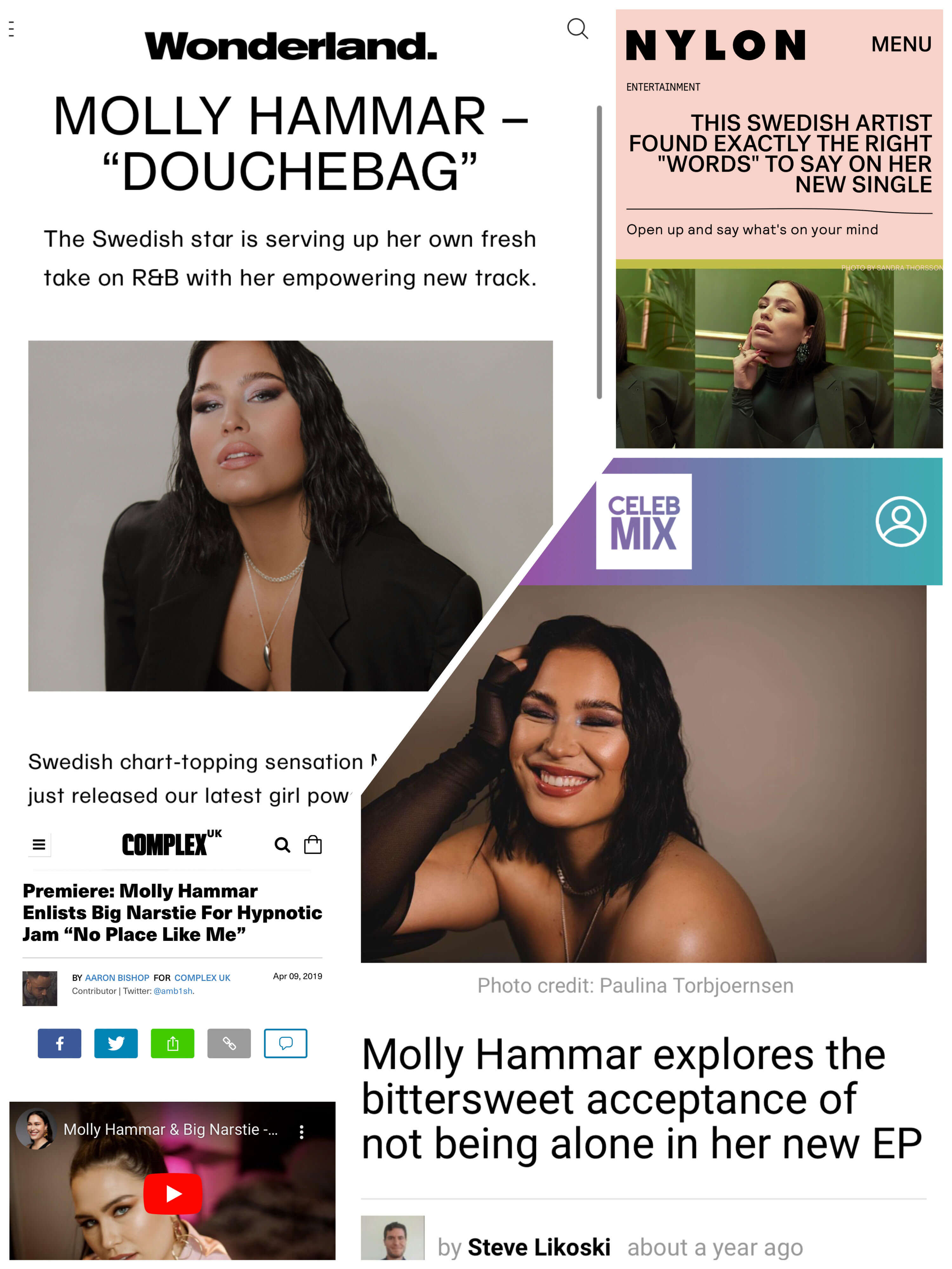 Molly Hammar rose to fame in Sweden at just 16 years old as runner up on Swedish Idol. 7 years later at the age of 22, with 2 gold singles under her belt, the artist was ready to move away from a pure pop focus, to fulfil her dream of making soulful R&B music and to become known for her music outside of Sweden. She left her major record label to sign up with Sharpline Distro. Hypnotic lead single ‘No Place Like Me’ paired Molly’s sensual vocal with percussive beats, and a killer rap from UK Grime legend Big Narstie the track was followed up with dancefloor-friendly ‘WORDS’